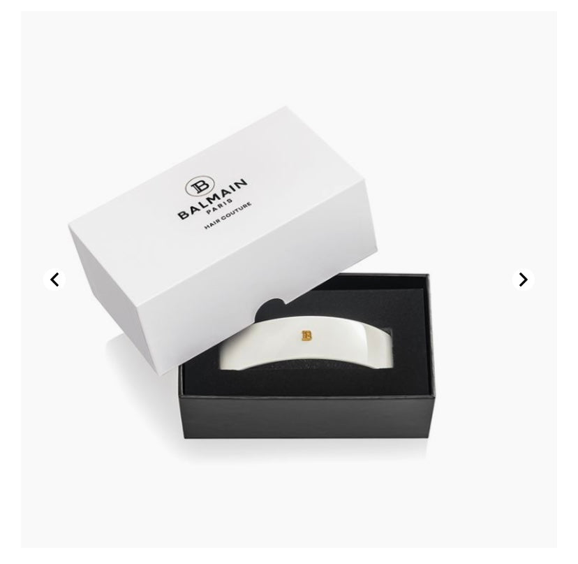 Un fermaglio, taglia large, per capelli realizzato in acetato di cellulosa con il logo "B" di Balmain placcato in oro 14K. Questo materiale, estremamente resistente ma flessibile, è ipoallergenico e delicato sui capelli e sul cuoio capelluto. La barrette è dotata di una vera clip francese di alta qualità per assicurare una presa perfetta sui capelli. Pensata per capelli normali o spessi, ideale per raccogliere i capelli, per adornare una coda di cavallo o per migliorare un up-do.