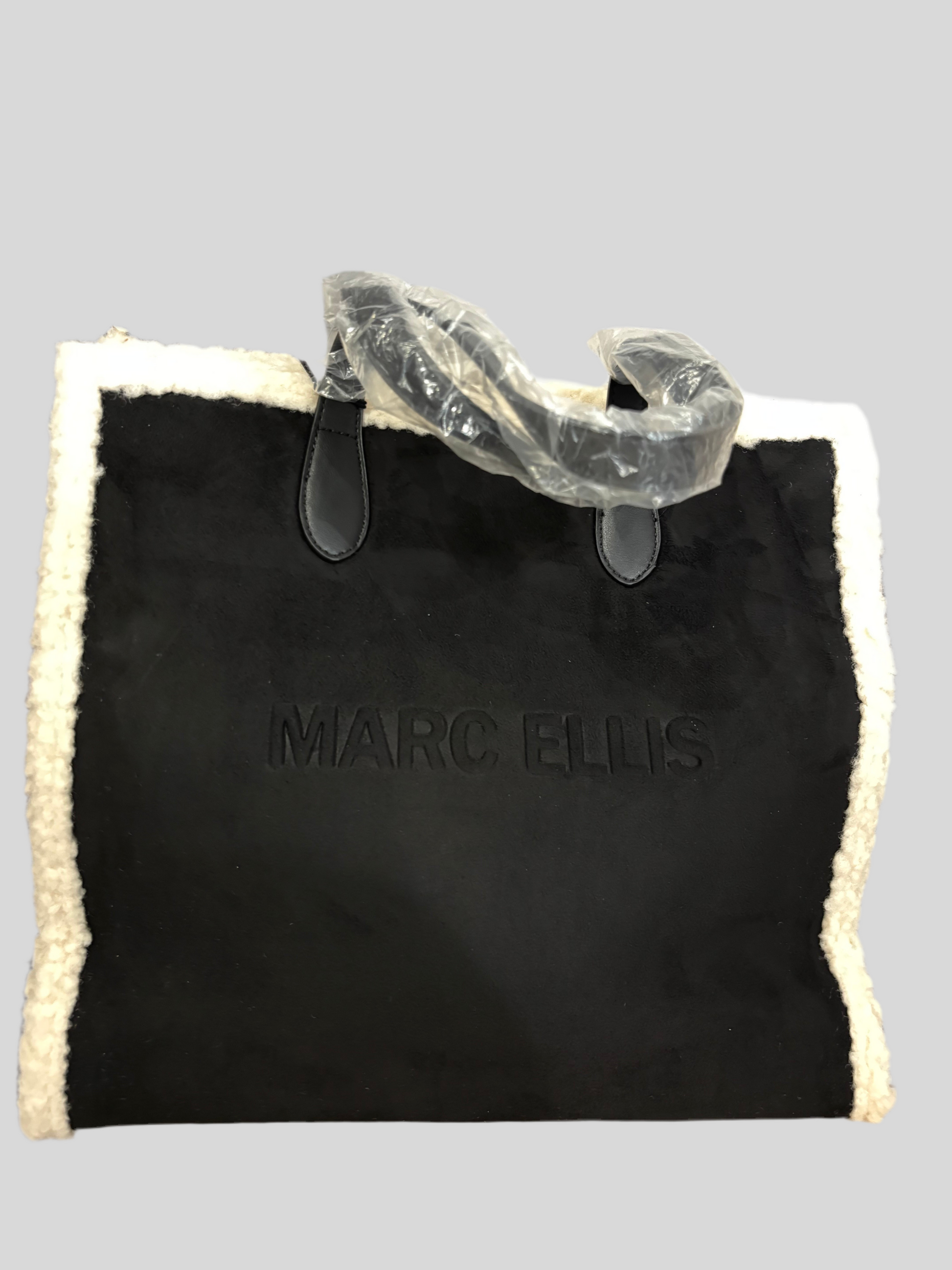 Borsa a mano in poliestere morbido suede con profili in shearling, manici in ecopelle, chiusura a zip, tracolla regolabile e rimovibile