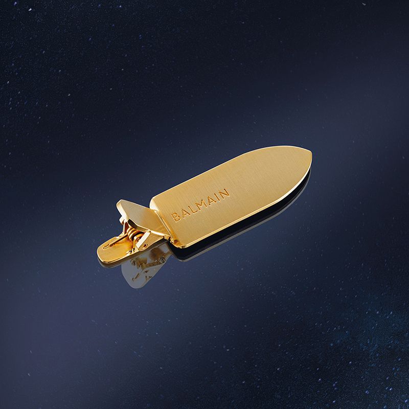 Clip realizzata a mano e placcata in oro 18K è incisa al centro con l'iconico logo Balmain.