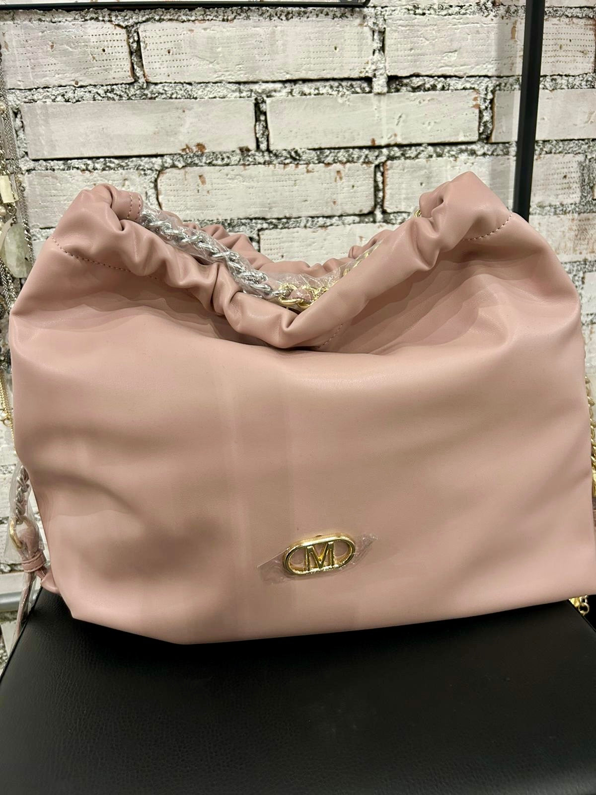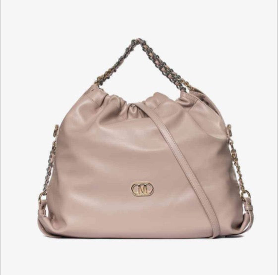 Borsa donna realizzata in ecopelle con design arricciato, manico in catena, tracolla removibile e placca logo frontale.