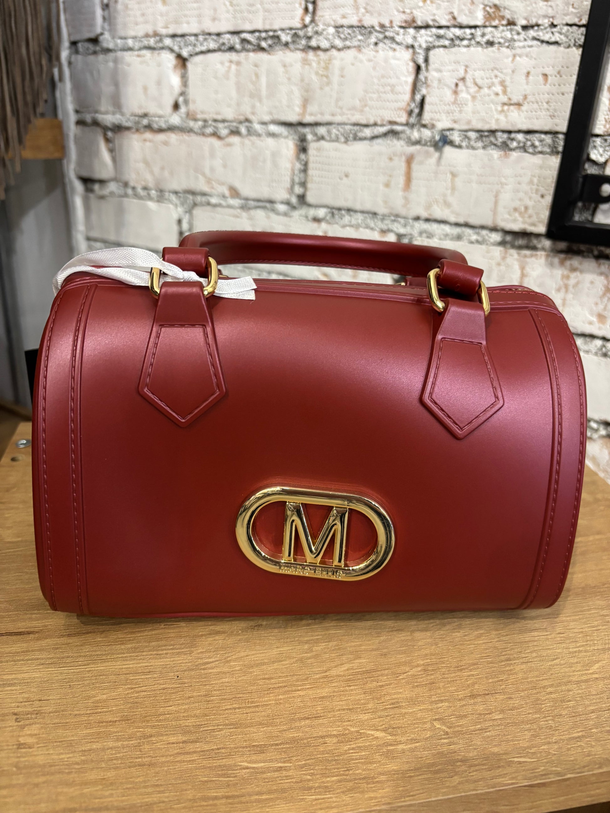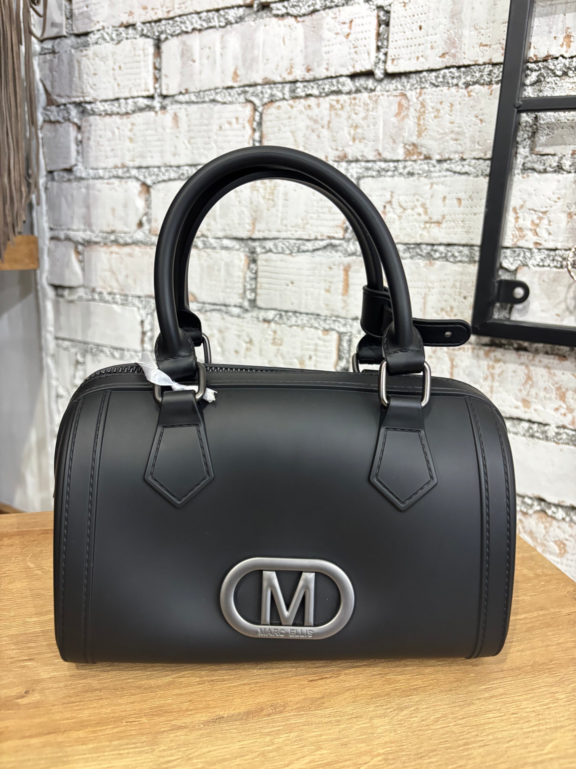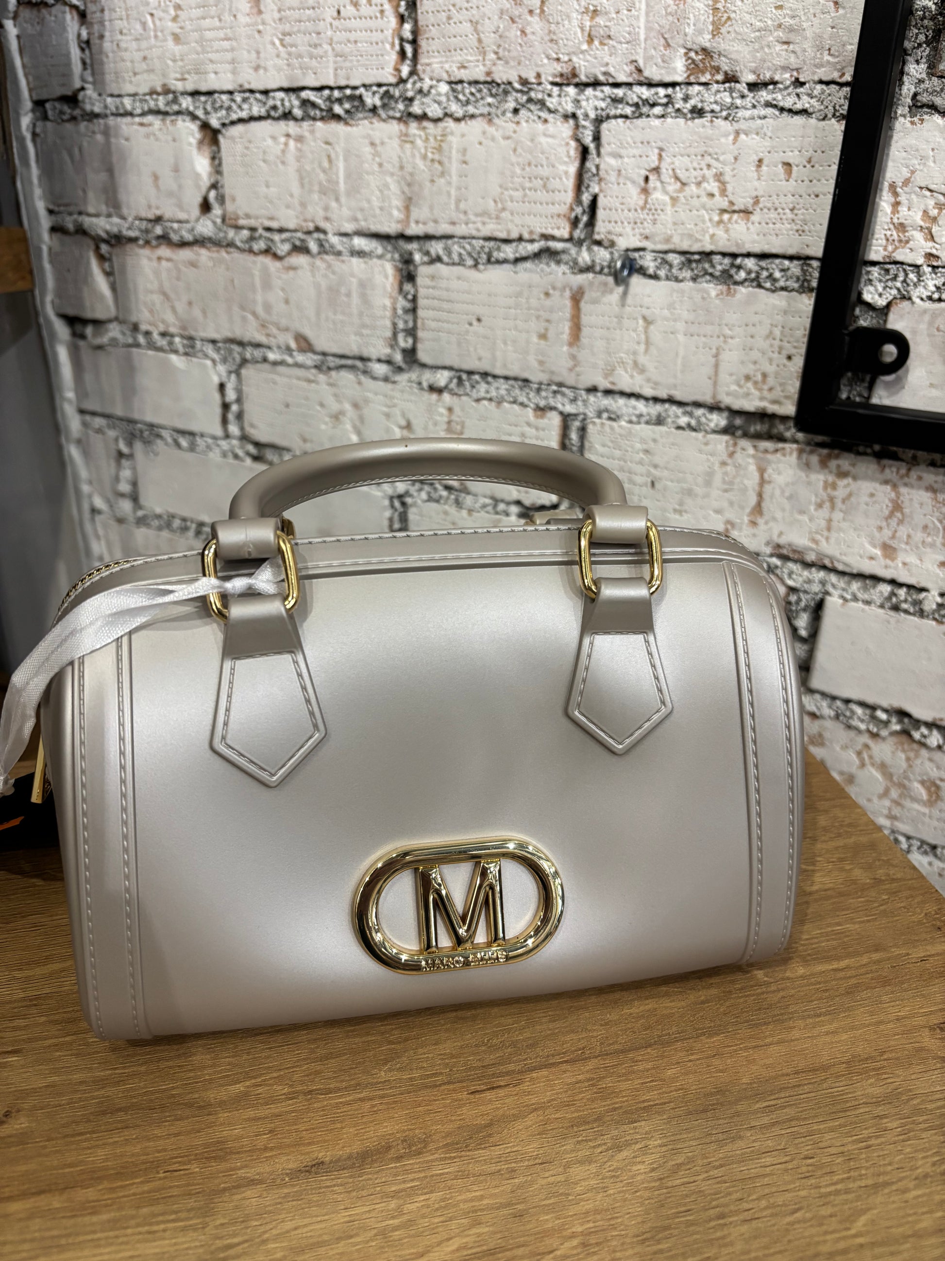 Borsa a spalla in gomma, tracolla rimovibile, logo visibile in oro, chiusura a zip
